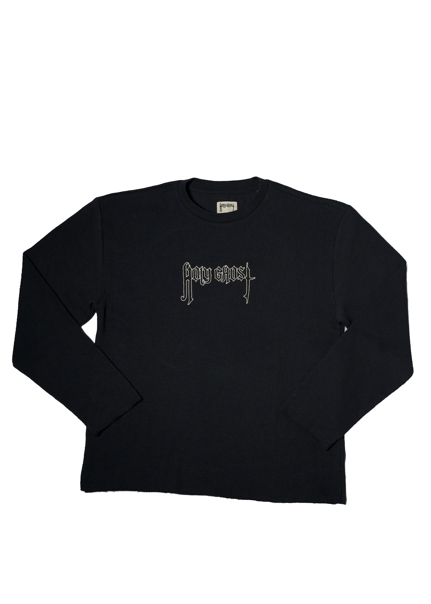 A lightweight long sleeve thermal designed for everyday layering with a clean, relaxed silhouette. Constructed from breathable cotton waffle fabric in a washed black finish, this piece delivers warmth without weight and a refined, understated look.